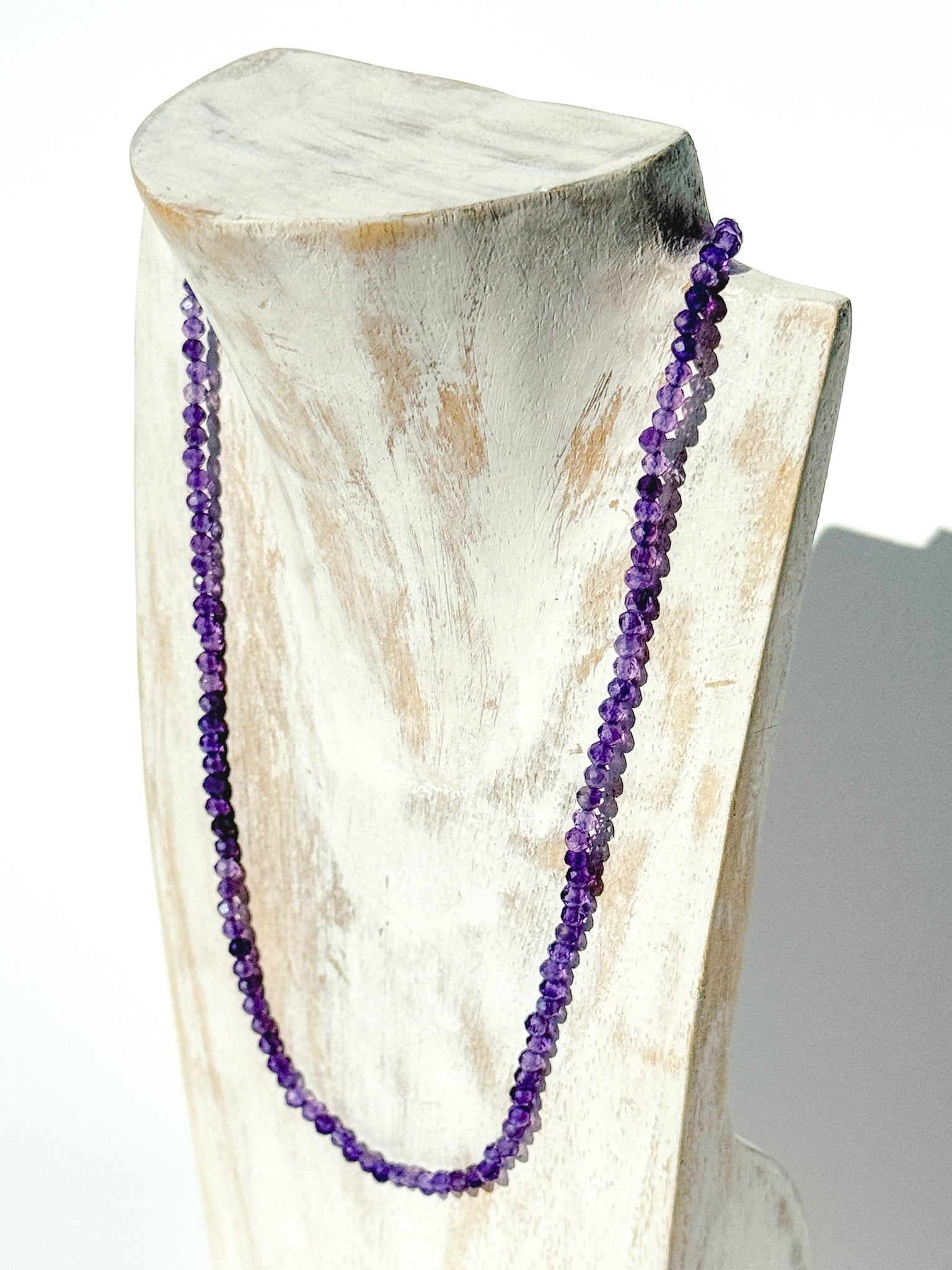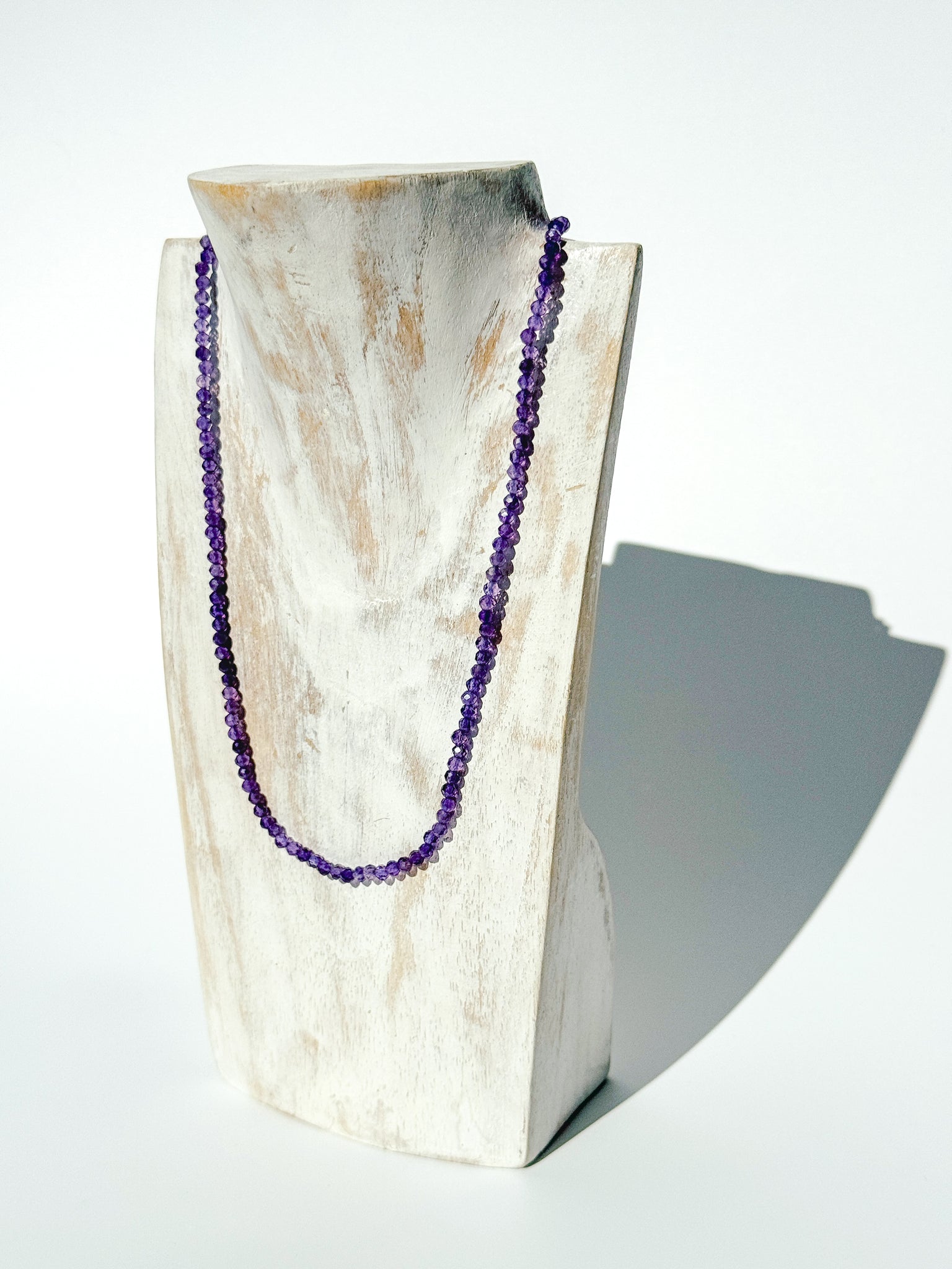 The Solace Choker – Amethyst is where minimalism meets mindfulness. Handcrafted with 3 mm faceted Amethyst gemstones, this sleek piece carries a serene lilac hue that symbolises peace, balance, and spiritual awareness. Its refined simplicity makes it a timeless piece for both everyday wear and intentional moments of stillness.