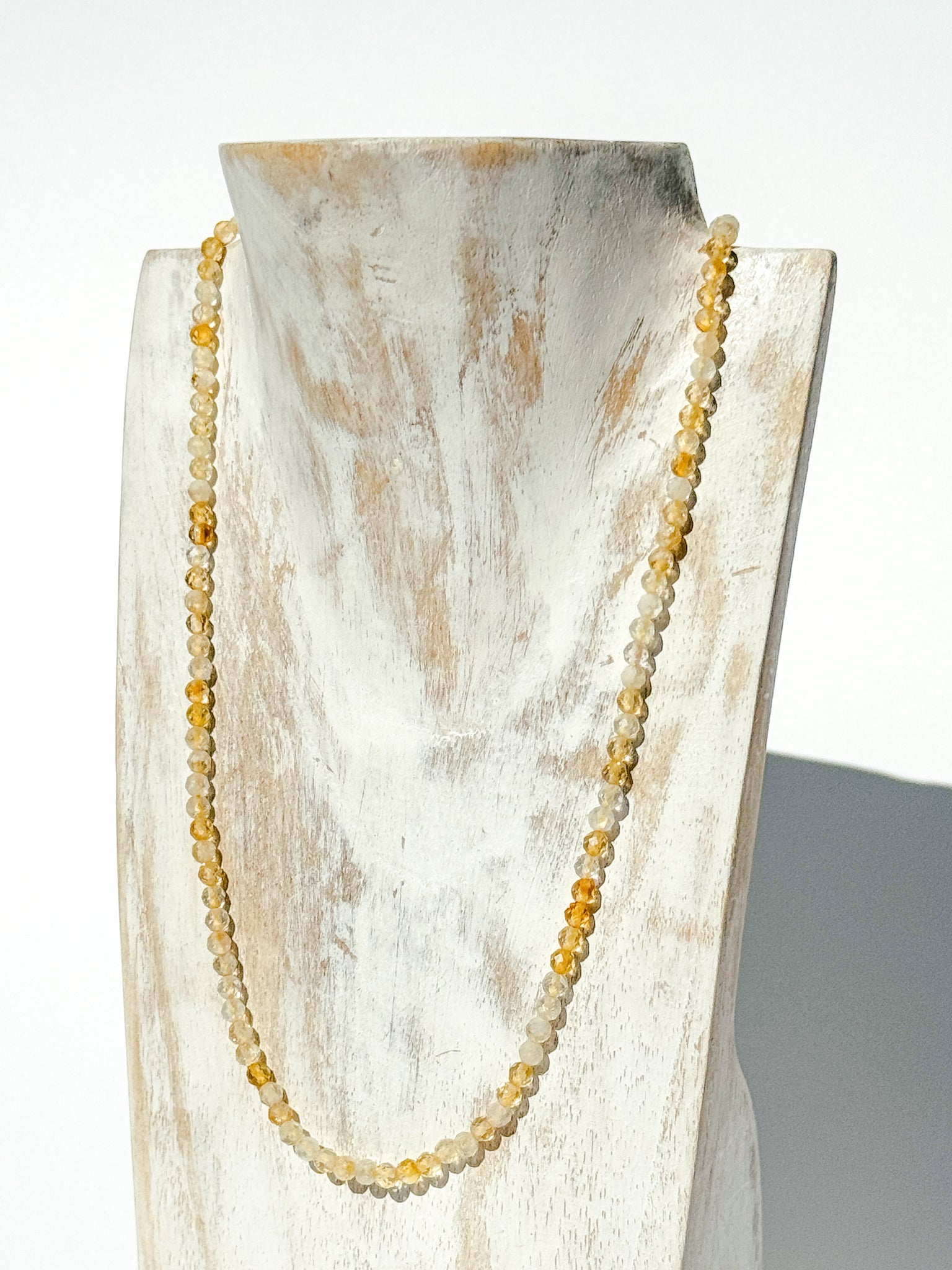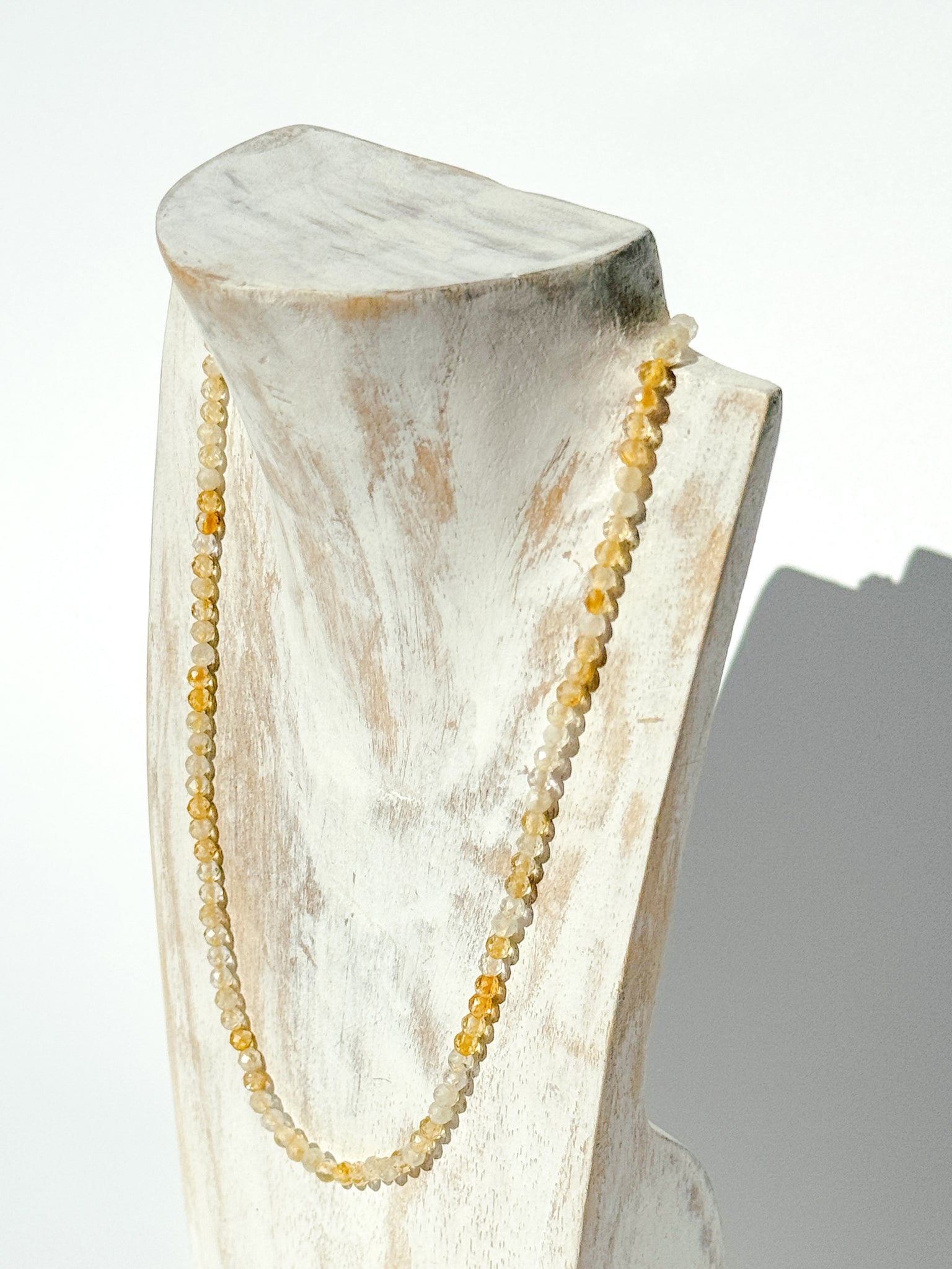 The Solace Choker – Citrine captures sunlight in minimalist form — a timeless piece that radiates warmth, abundance, and optimism. Handcrafted with 3 mm faceted Citrine gemstones, its golden hue reflects the energy of manifestation and joy, inspiring you to move through life with clarity and courage. Light, elegant, and endlessly wearable, it’s made to lift your energy every day.
