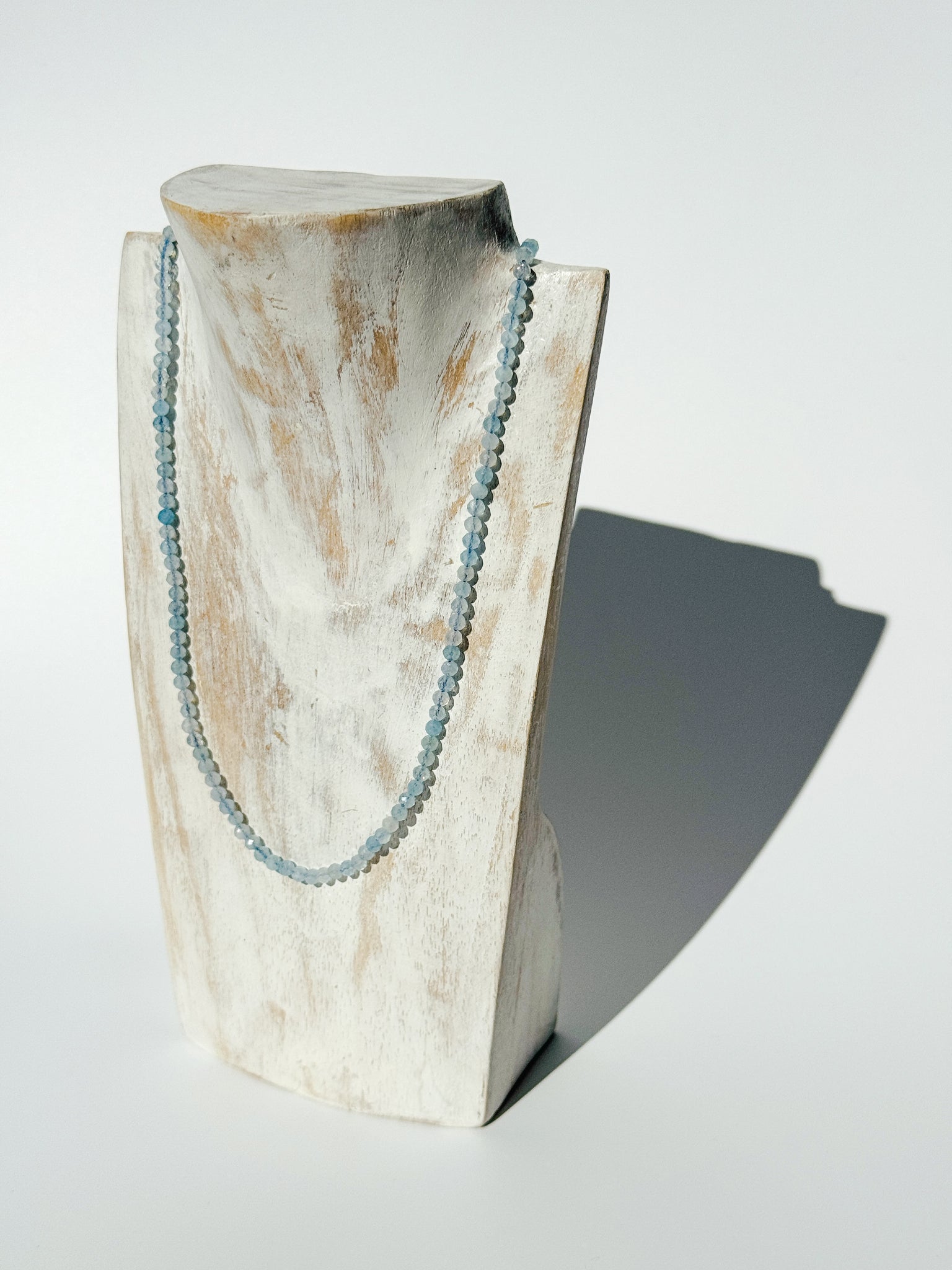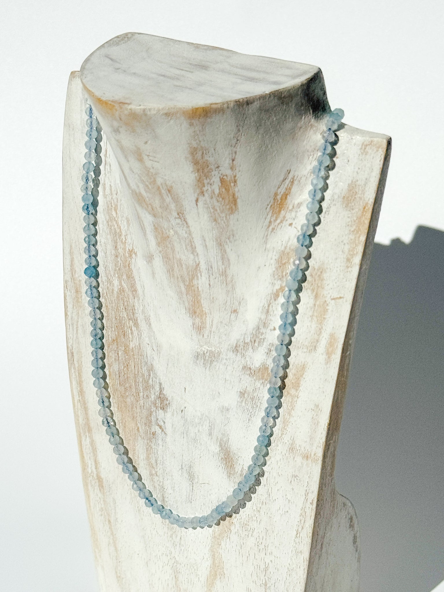 The Solace Silver Choker – Aquamarine carries the tranquil rhythm of the ocean. Handcrafted with 3 mm faceted Aquamarine gemstones, each bead reflects the stillness of calm waters and the purity of open skies. Elegant yet effortless, this piece clears emotional turbulence and invites communication that flows with ease and truth.