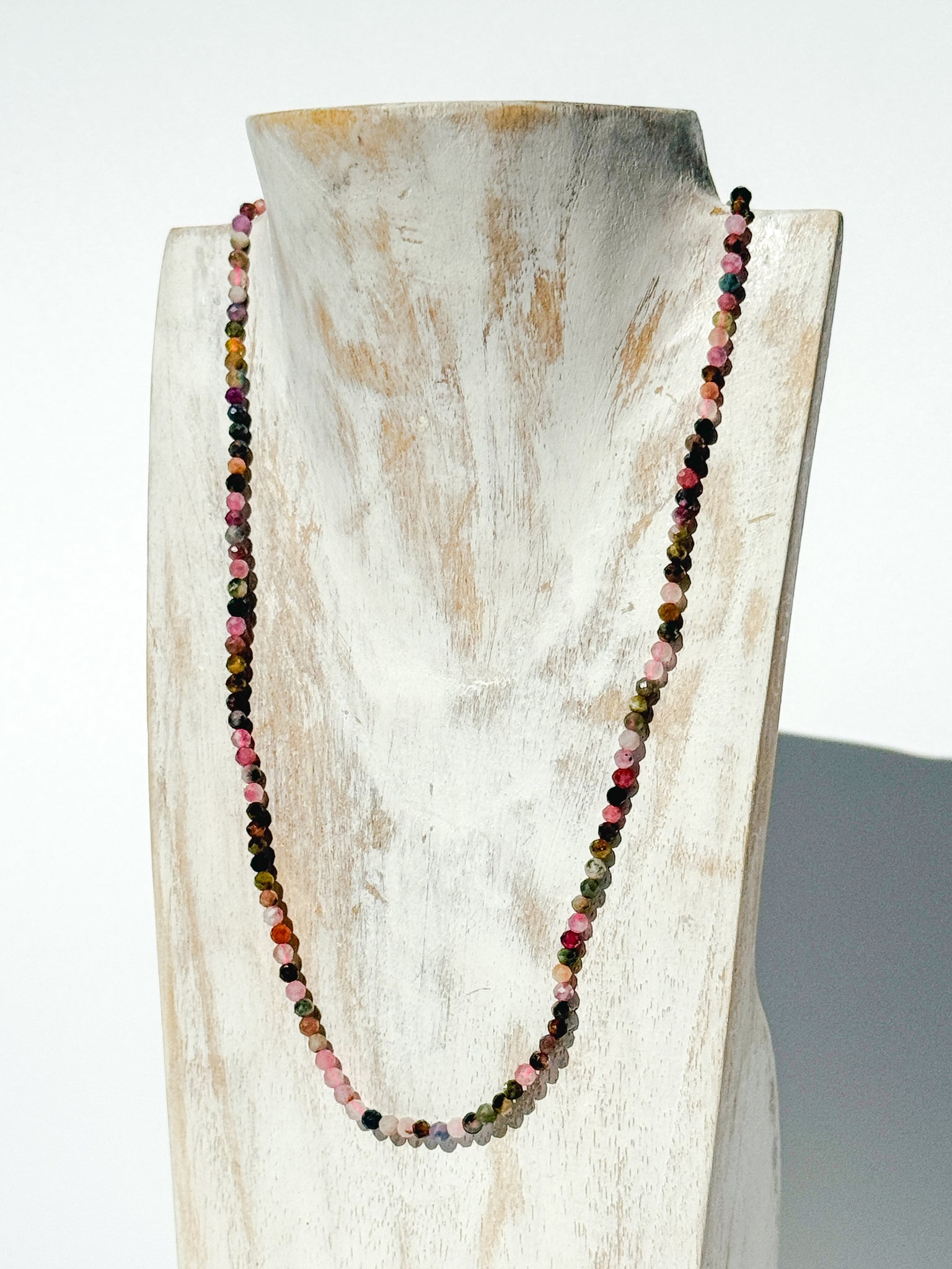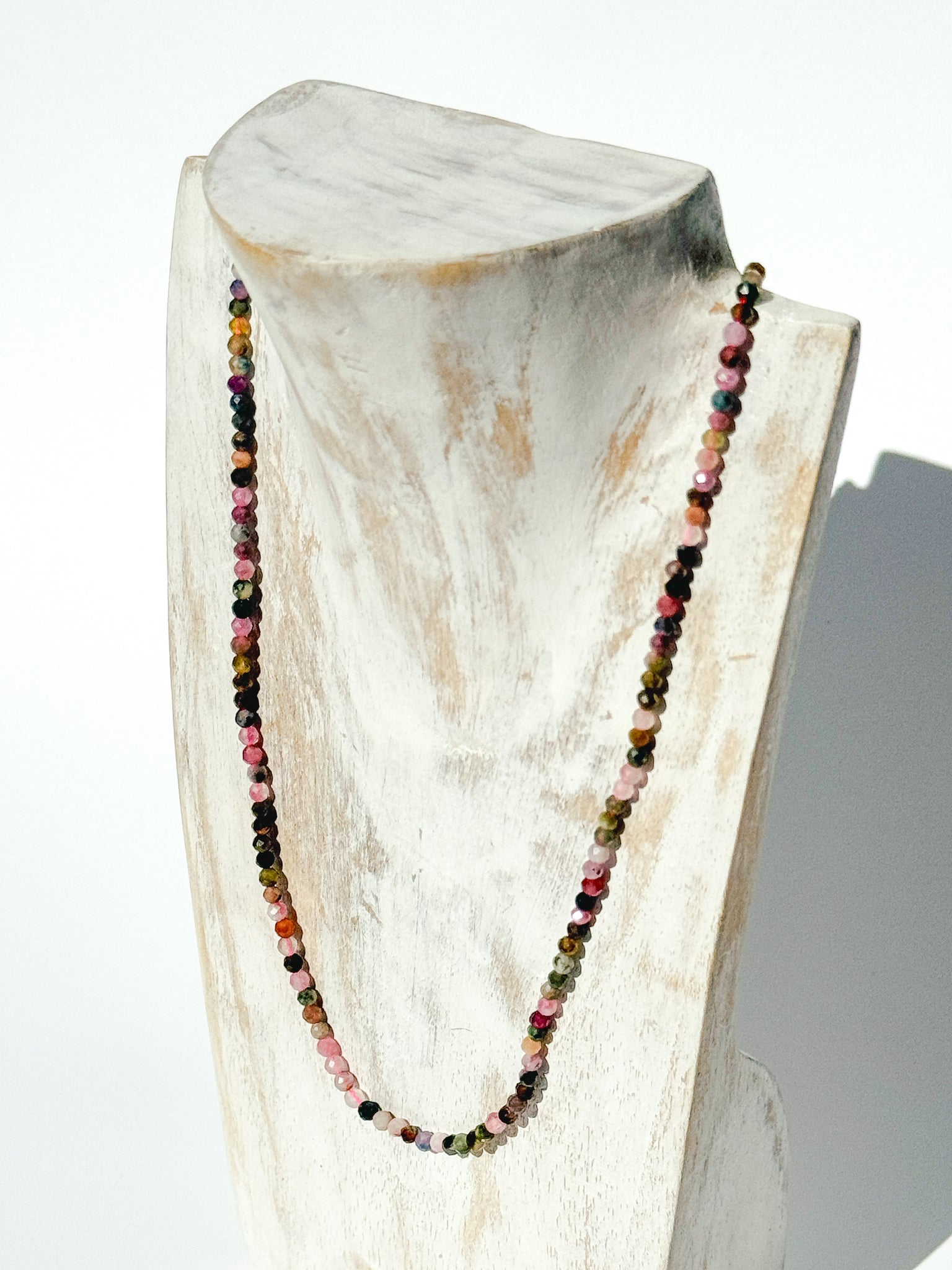 The Solace Choker – Mixed Tourmaline is a radiant celebration of colour and balance. Handcrafted with 3 mm faceted Mixed Tourmaline gemstones, each tiny bead offers its own unique hue and vibration — together forming a delicate spectrum of harmony and emotional renewal.