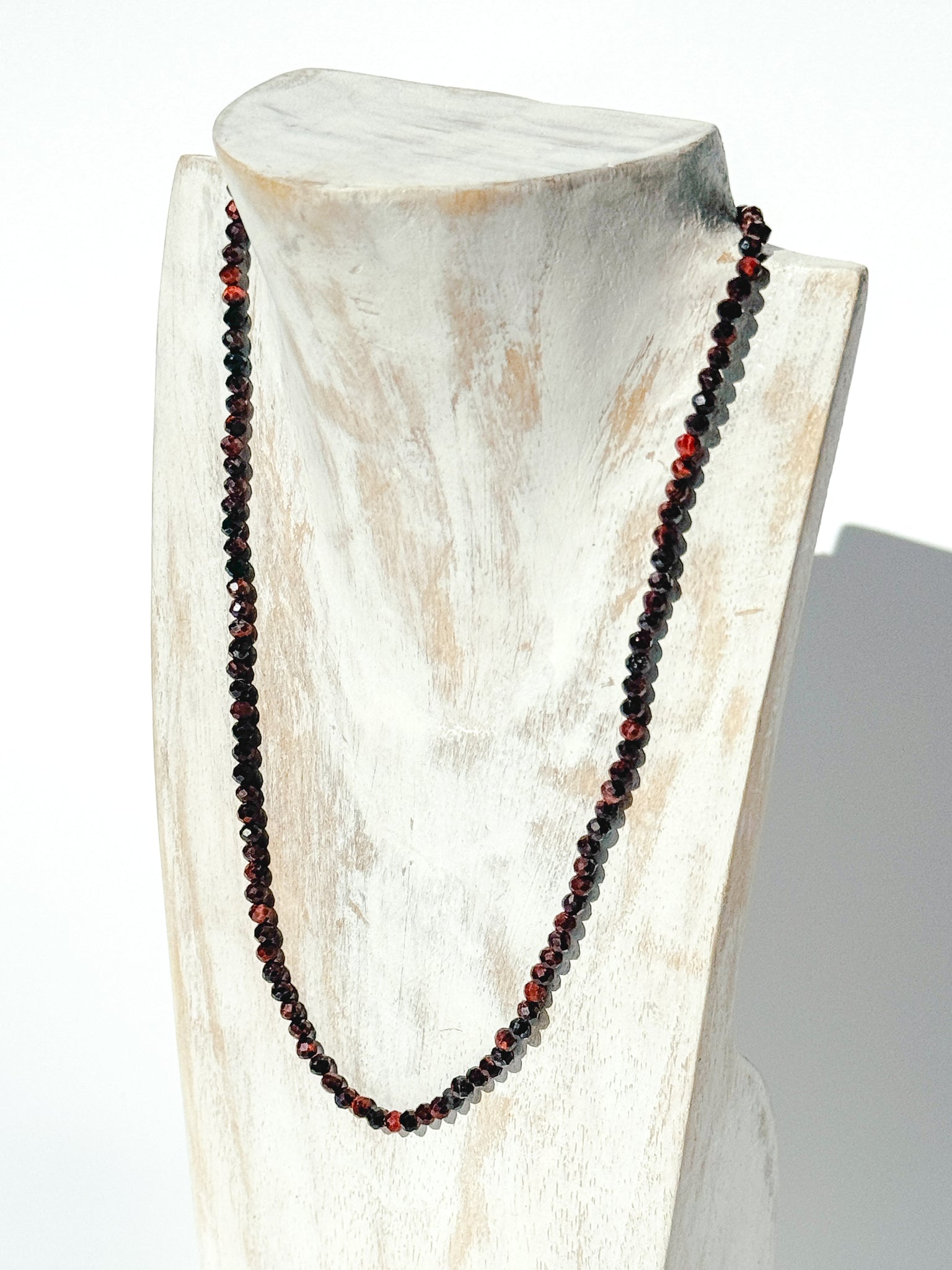 The Solace Choker – Red Tiger Eye radiates courage and determination with sleek, minimalist style. Handcrafted with 3 mm faceted Red Tiger Eye gemstones, its deep, fiery tones shimmer with subtle flashes of red and bronze — a reflection of focused energy and inner fire. This piece is made for those who lead with strength, grounded presence, and unstoppable spirit.