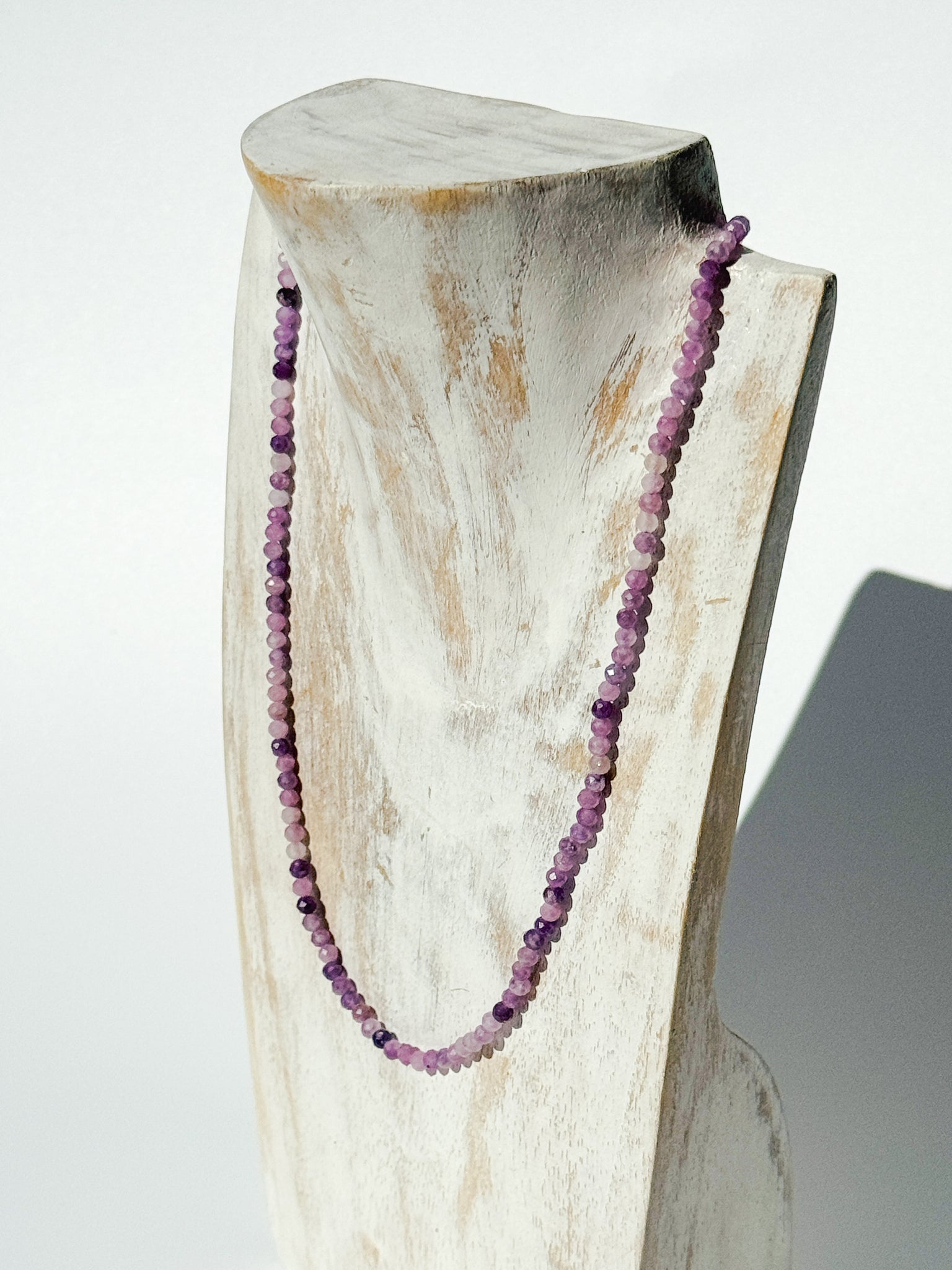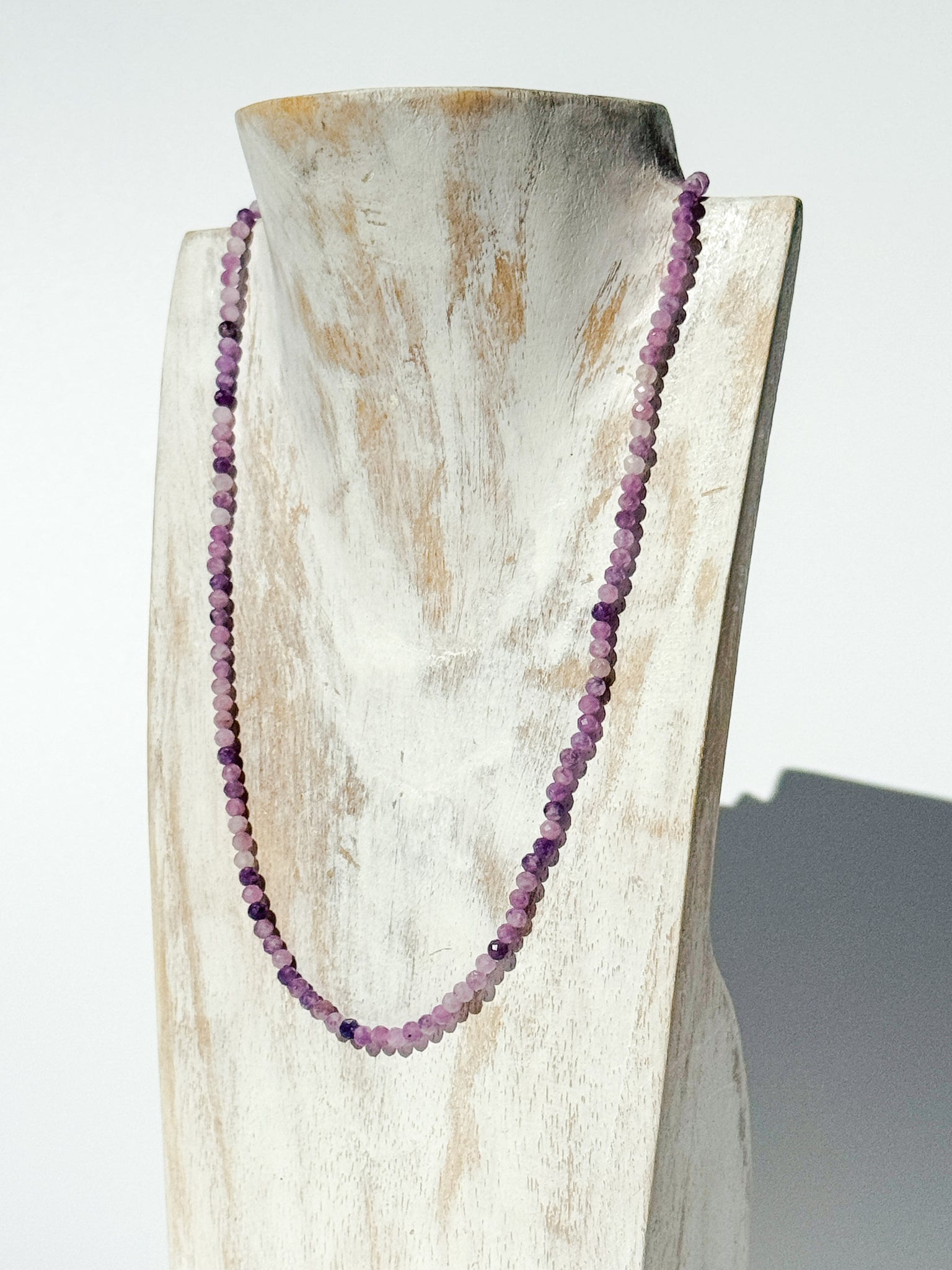 The Solace Choker – Lepidolite is a minimalist piece infused with serenity. Handcrafted with 3 mm faceted Lepidolite gemstones, this gentle lavender crystal glows with a subtle lilac shimmer — a symbol of calm release and quiet strength. Its refined simplicity makes it a daily talisman for peace, grounding, and emotional renewal.