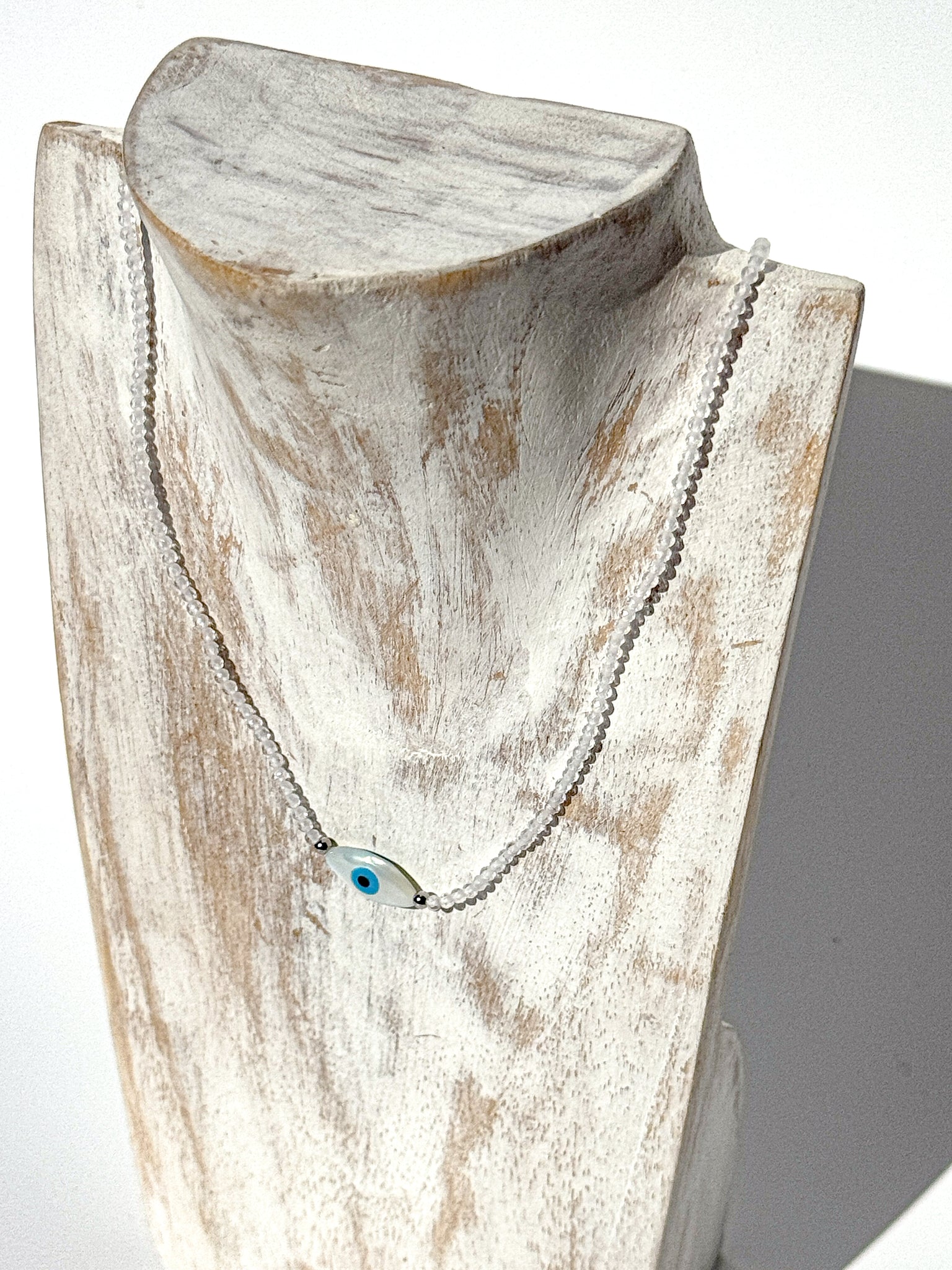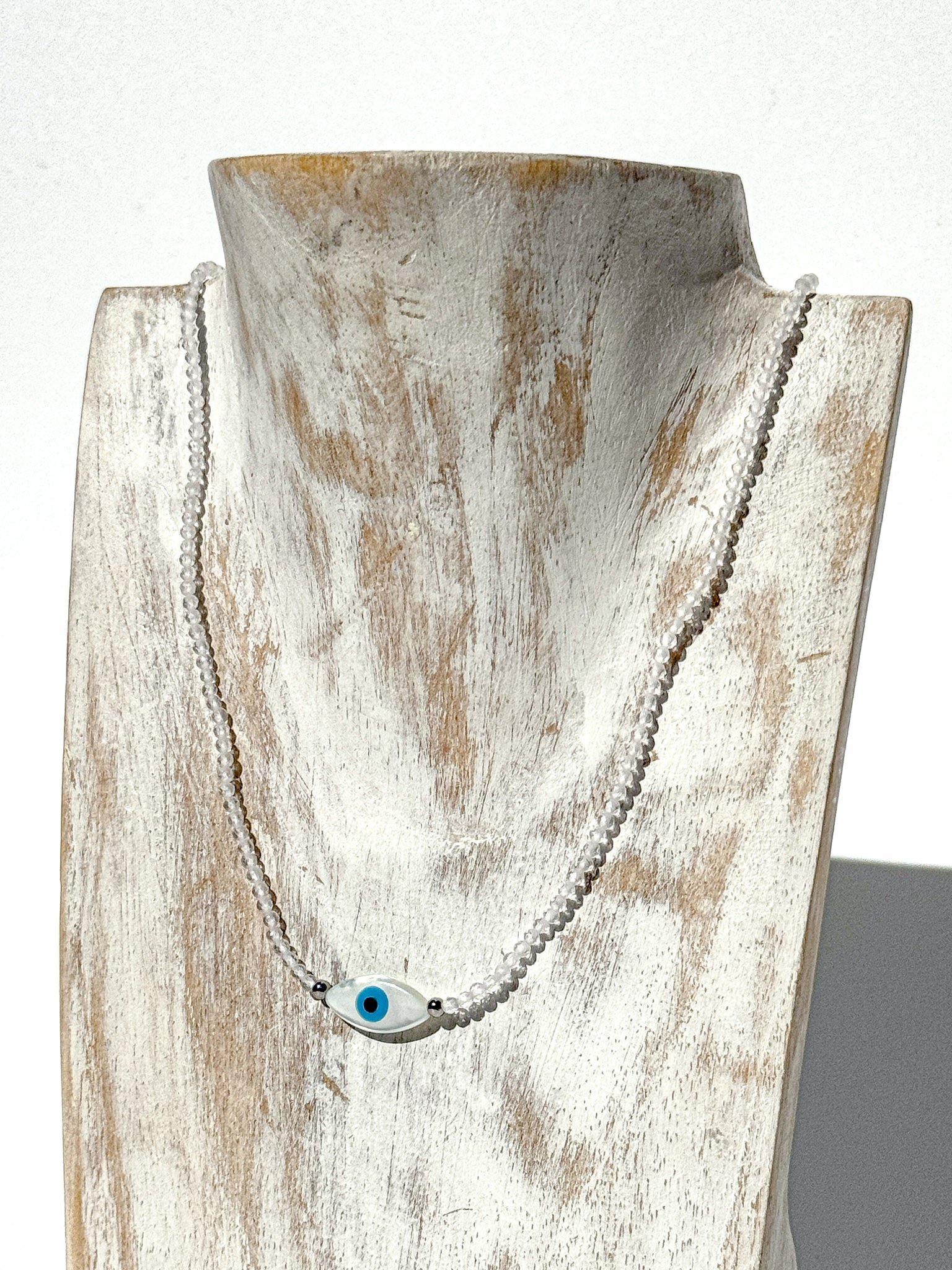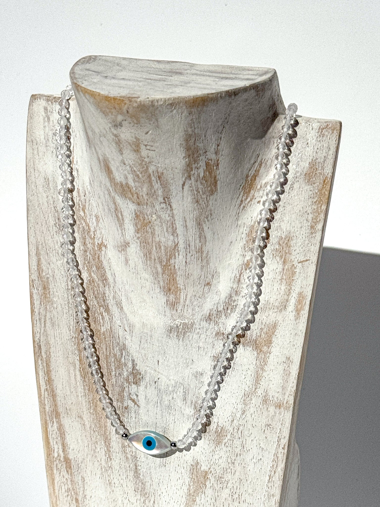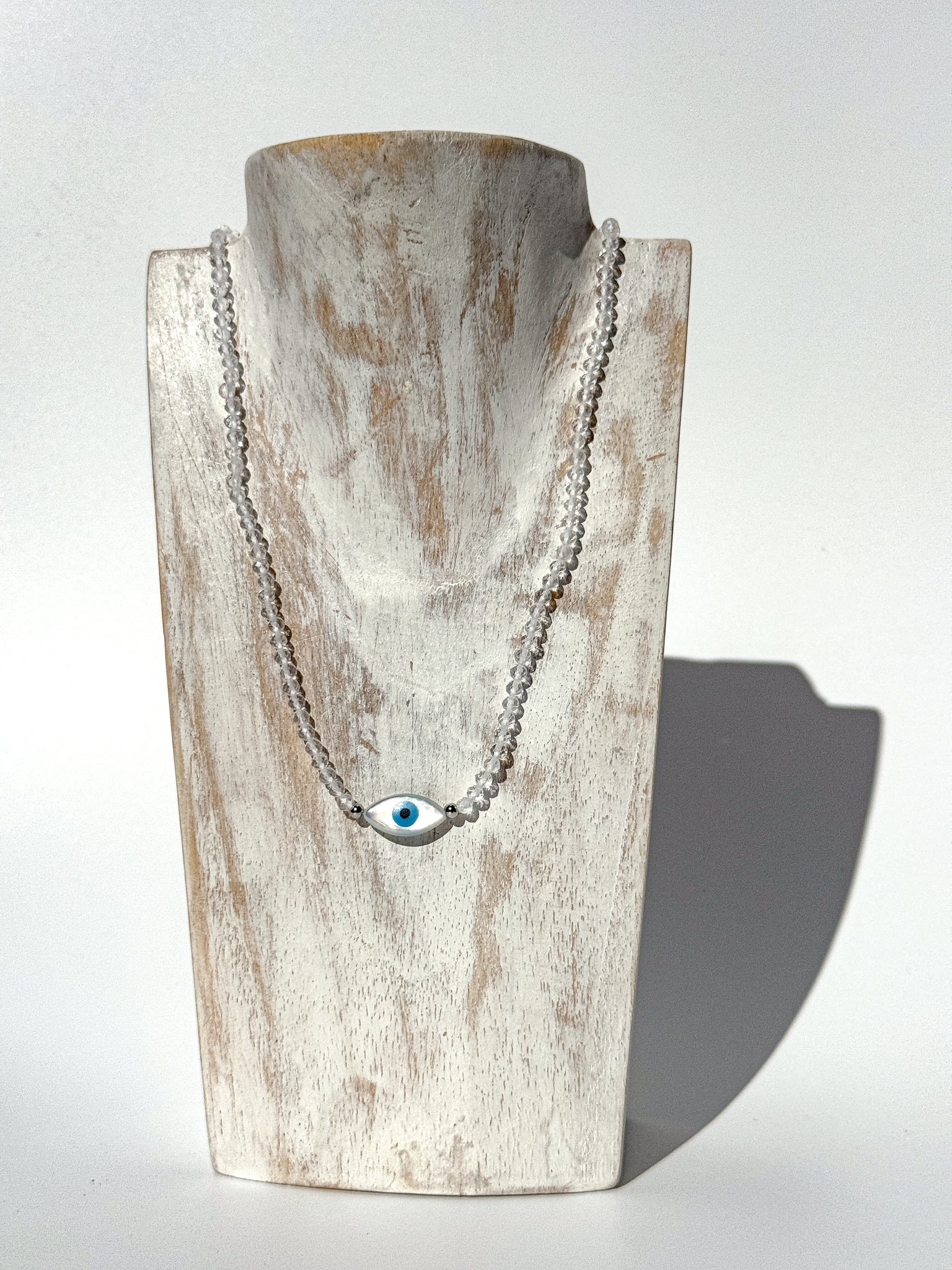 Subtle, sacred, and designed for daily wear — this Ceramic Evil Eye Crystal Choker merges ancient protection with the purifying power of Clear Quartz. Handcrafted with love, it features 3 mm faceted Clear Quartz beads, their crystalline transparency reflecting light, intention, and truth. Paired with a hand-shaped, glazed ceramic evil eye pendant, this piece balances the energies of amplification and protection — aligning your aura with clear vision and radiant strength.