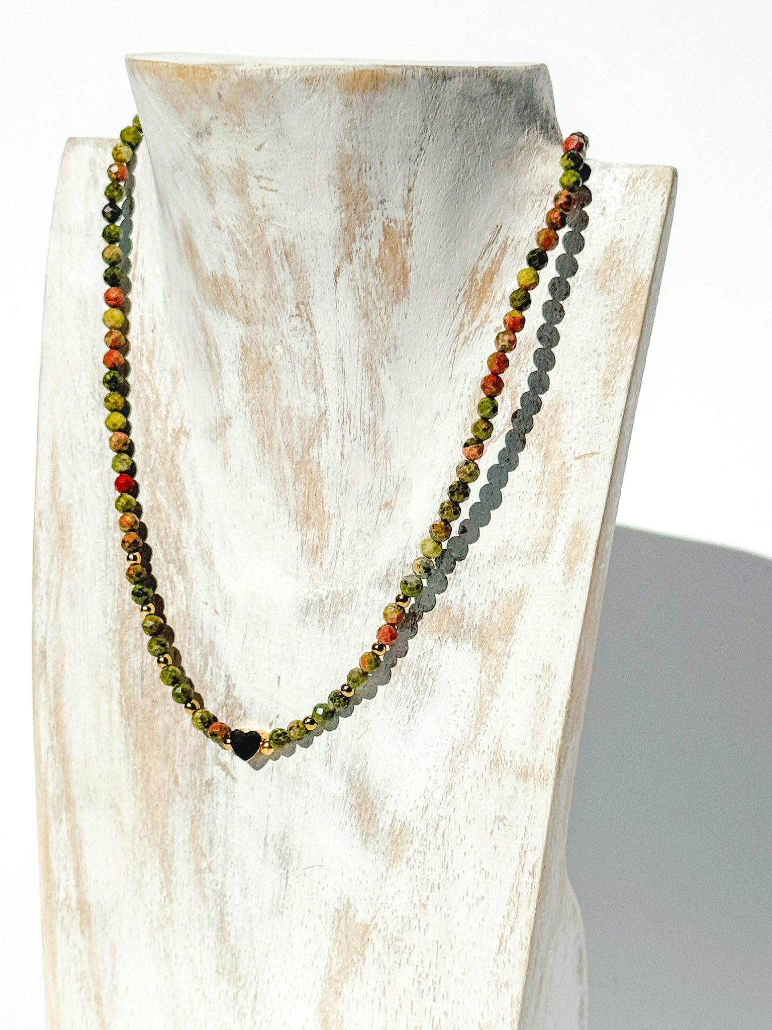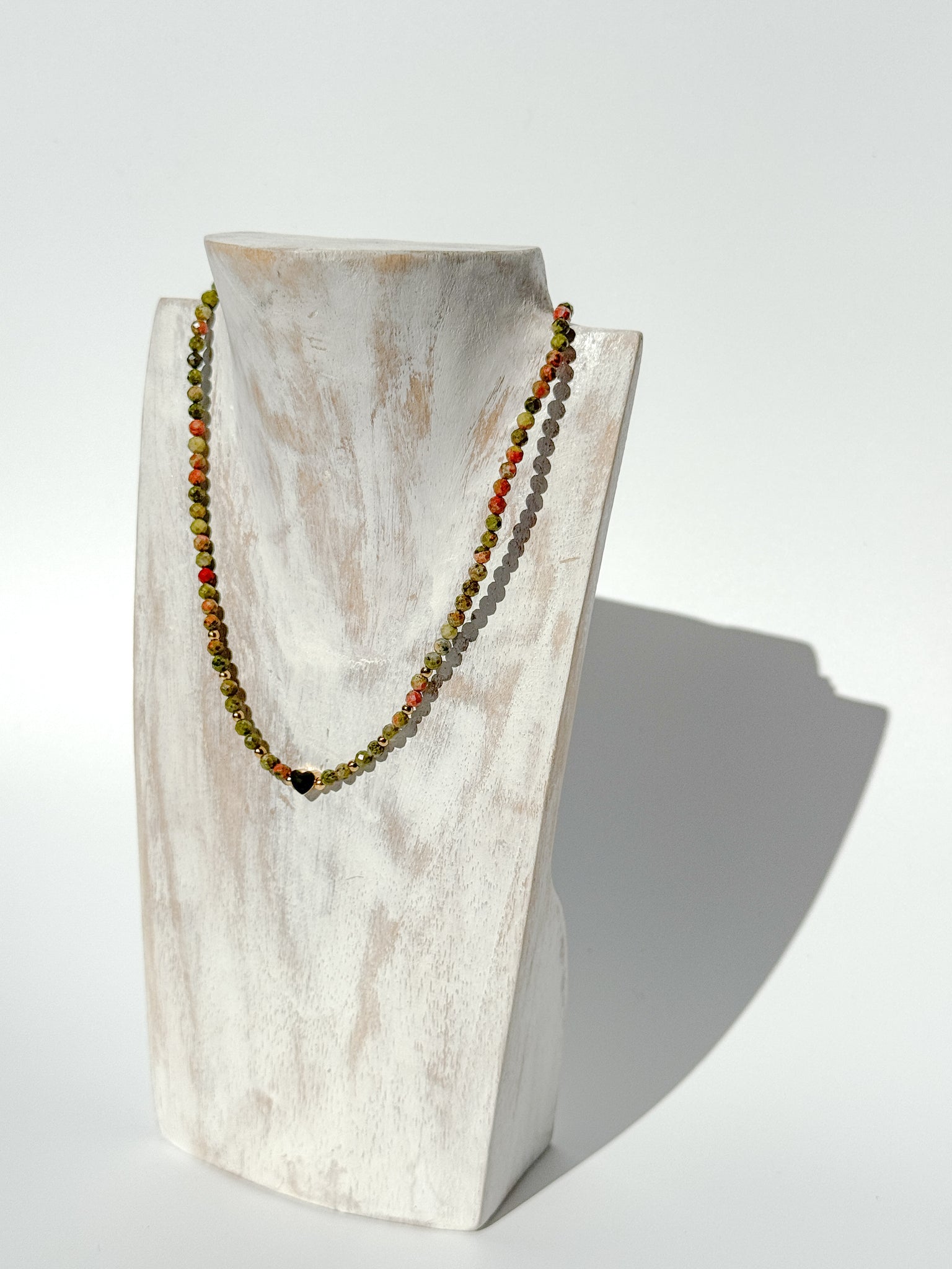 Fall in love with simplicity. The Luna Heart Choker blends elegance with intention — a delicately handcrafted piece strung with 3 mm faceted Unakite gemstones, finished with a gold or silver plated heart charm as a symbol of love, connection, and emotional renewal.