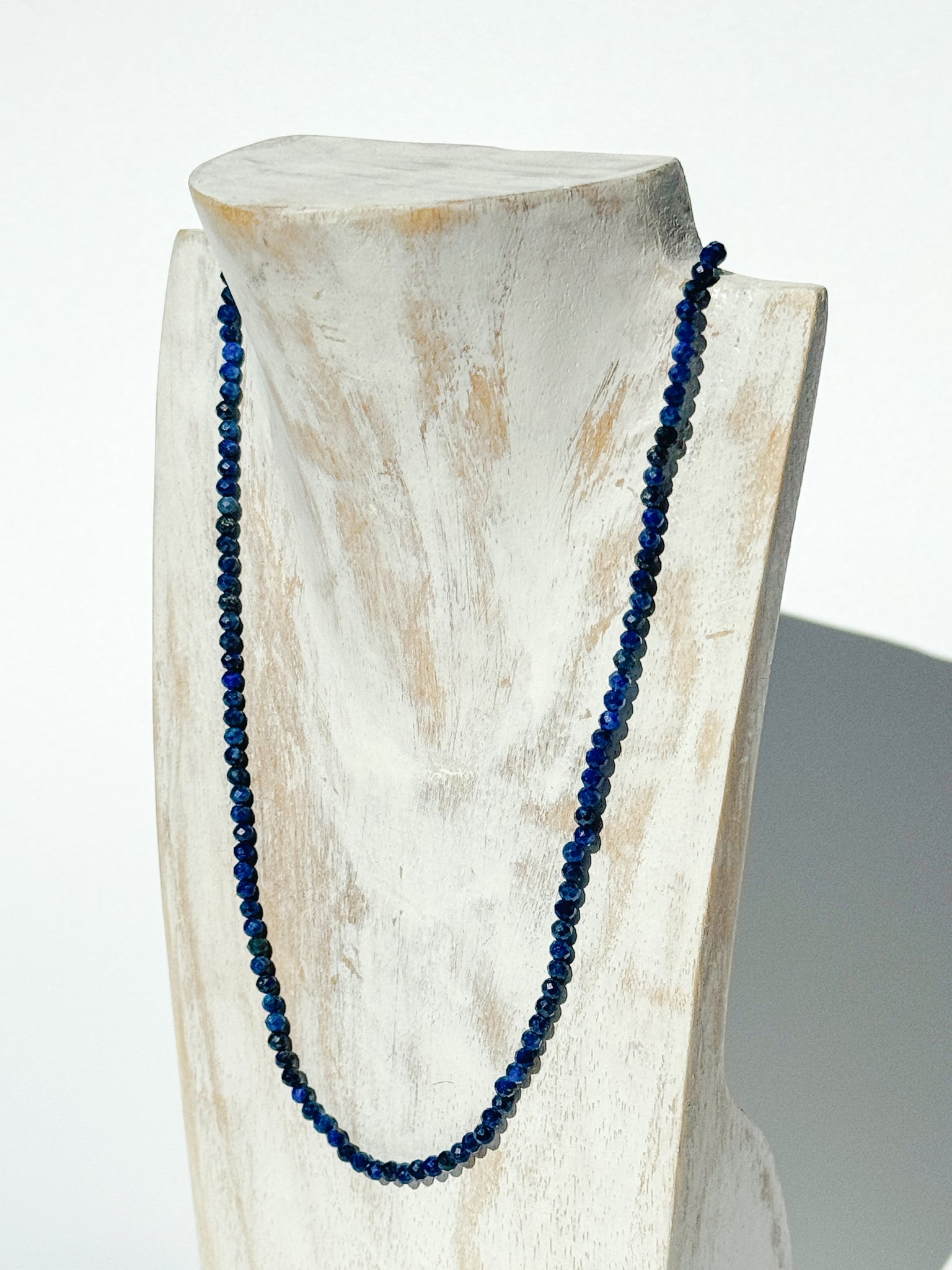 The Solace Choker – Lapis Lazuli embodies clarity, depth, and insight in its purest form. Handcrafted with 3 mm faceted Lapis Lazuli gemstones, this rich celestial-blue piece carries golden flecks that shimmer like starlight — a timeless reminder of truth, awareness, and self-expression. Its minimalist elegance makes it ideal for everyday wear, offering both refinement and resonance.