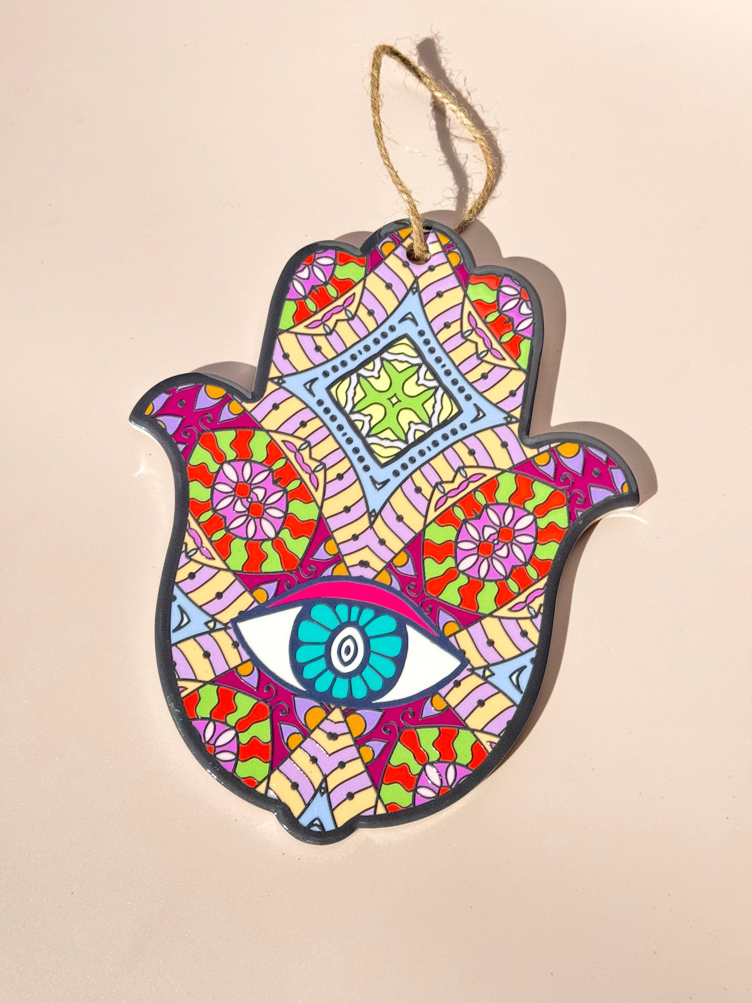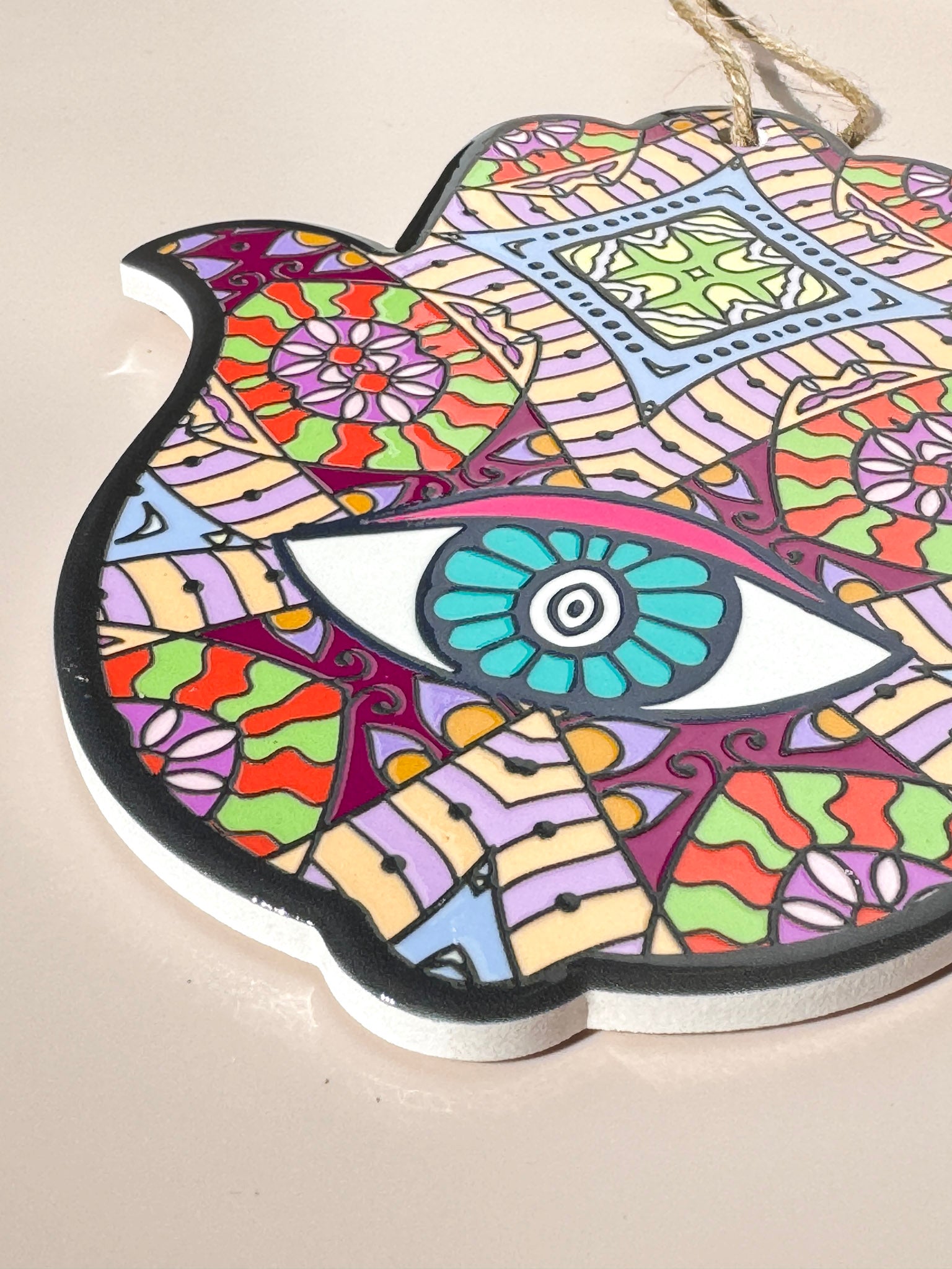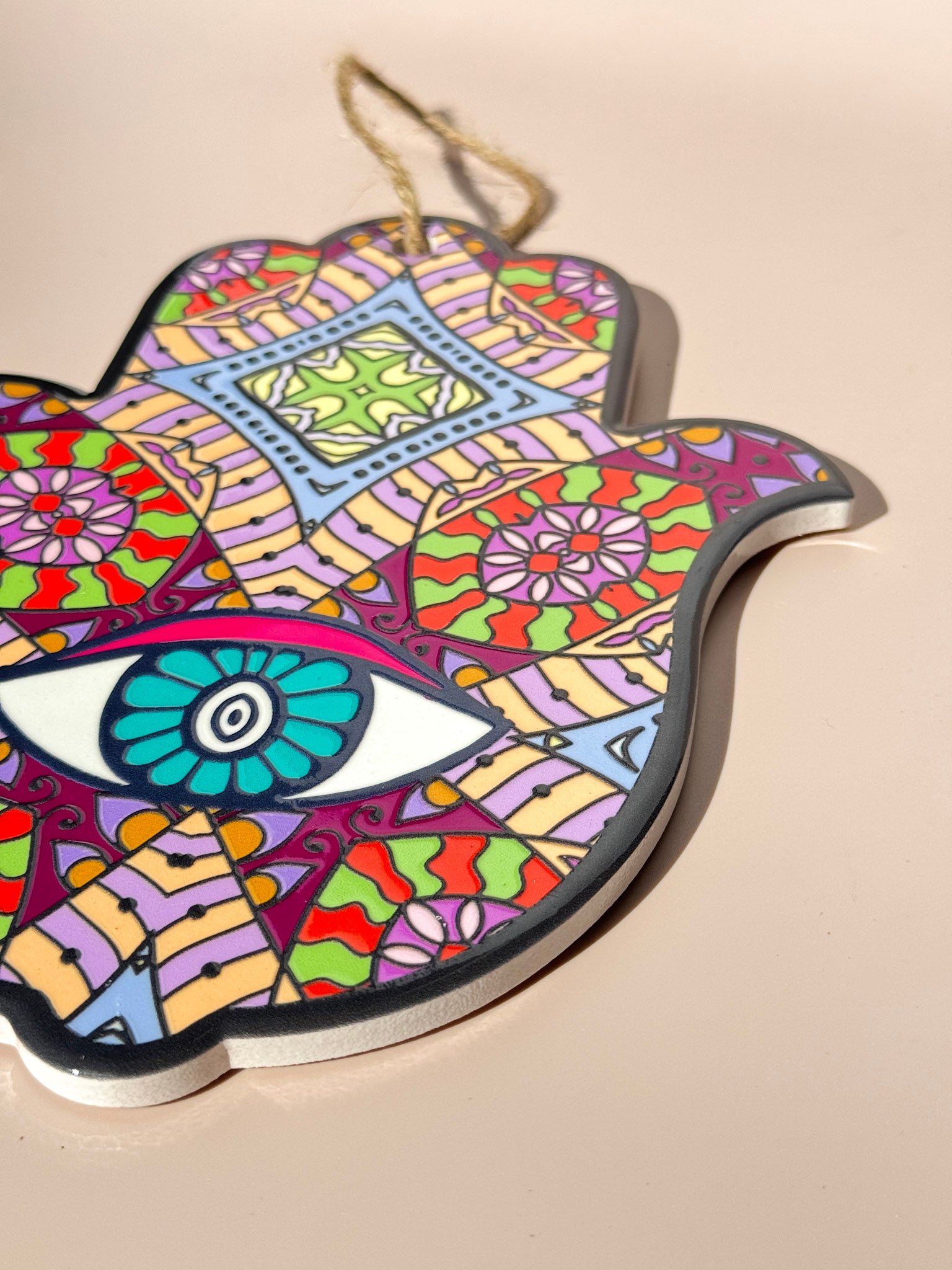 This ceramic Hamsa wall talisman is a radiant blend of geometry, symbolism, and soul. The intricate design weaves together a mandala flower at the crown and a bold evil eye at its base — uniting heart wisdom with intuitive protection.