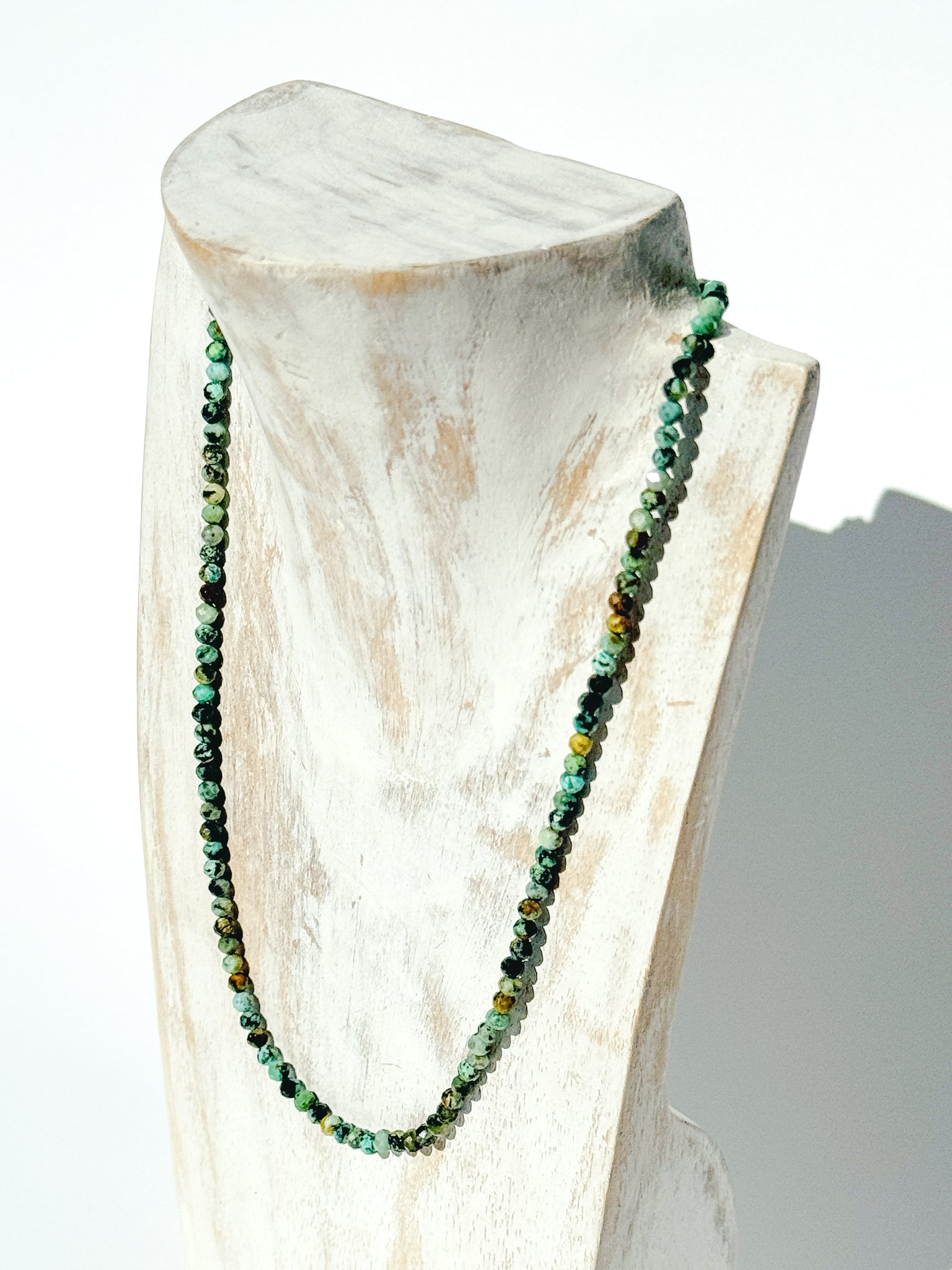 The Solace Choker – African Turquoise combines minimalist elegance with the grounding essence of change. Handcrafted with 3 mm faceted African Turquoise gemstones, this earthy blue-green piece embodies balance, evolution, and inner renewal. Its subtle tone makes it a perfect neutral with meaning — designed for those walking the path of steady growth.