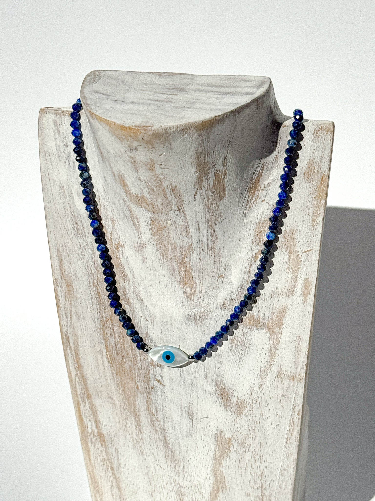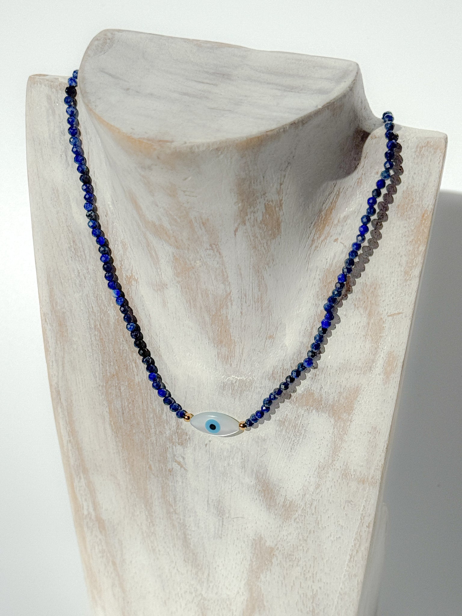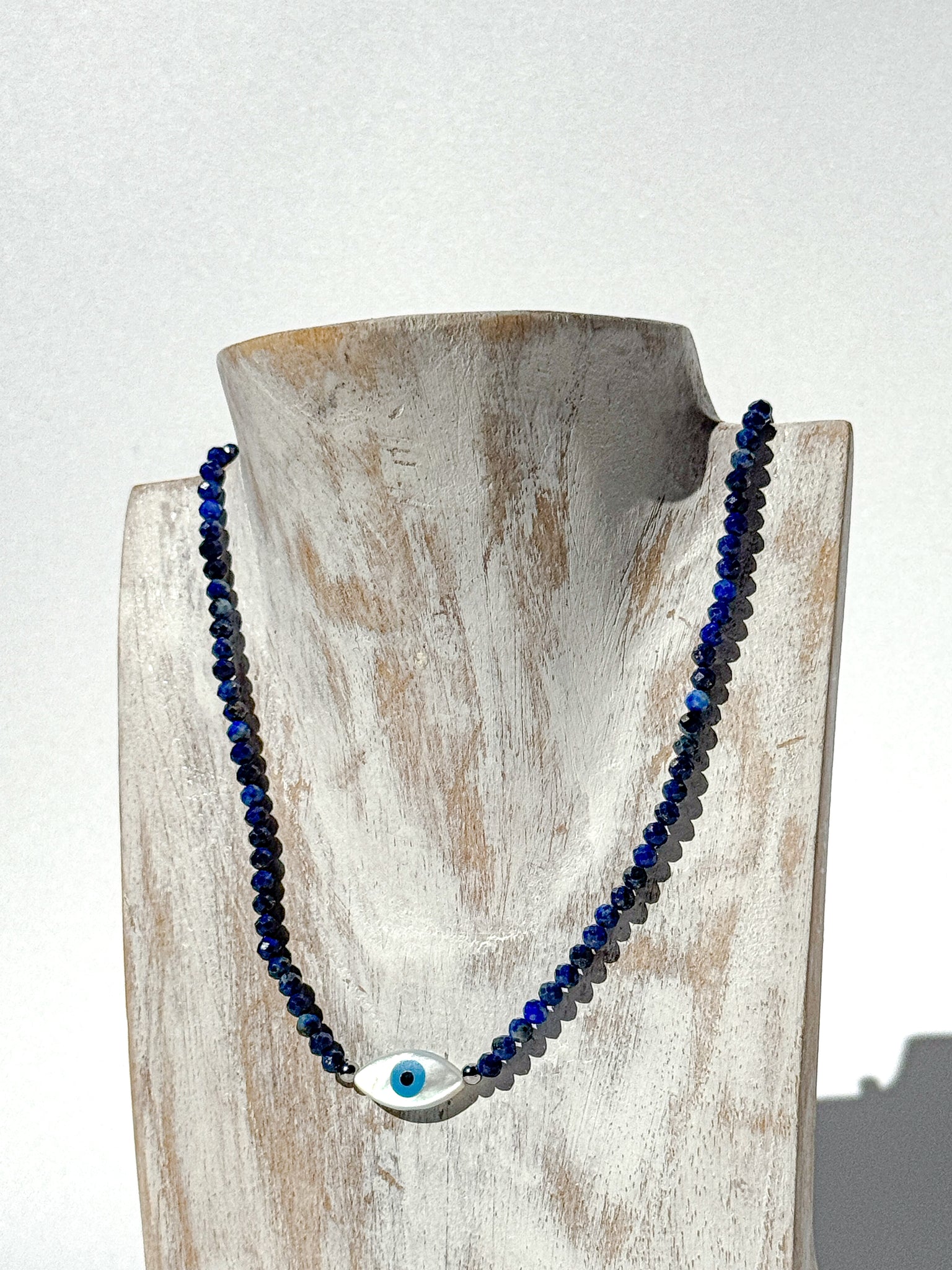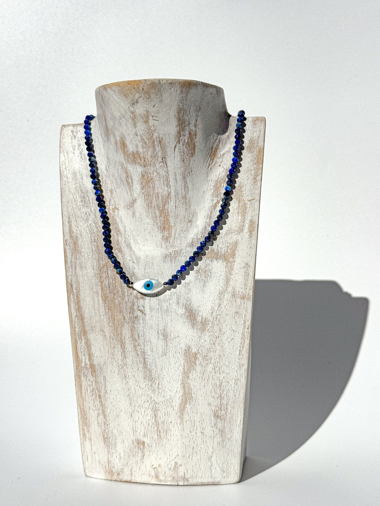 Subtle, sacred, and designed for daily wear — this Ceramic Evil Eye Crystal Choker unites ancient protection with the deep, royal energy of Lapis Lazuli. Handcrafted with love, it features 3 mm faceted Lapis Lazuli beads, their celestial blue hues flecked with golden pyrite, symbolising truth, intuition, and enlightenment. The hand-shaped, glazed ceramic evil eye pendant anchors this piece in timeless spiritual protection — guarding your energy while awakening higher vision.
