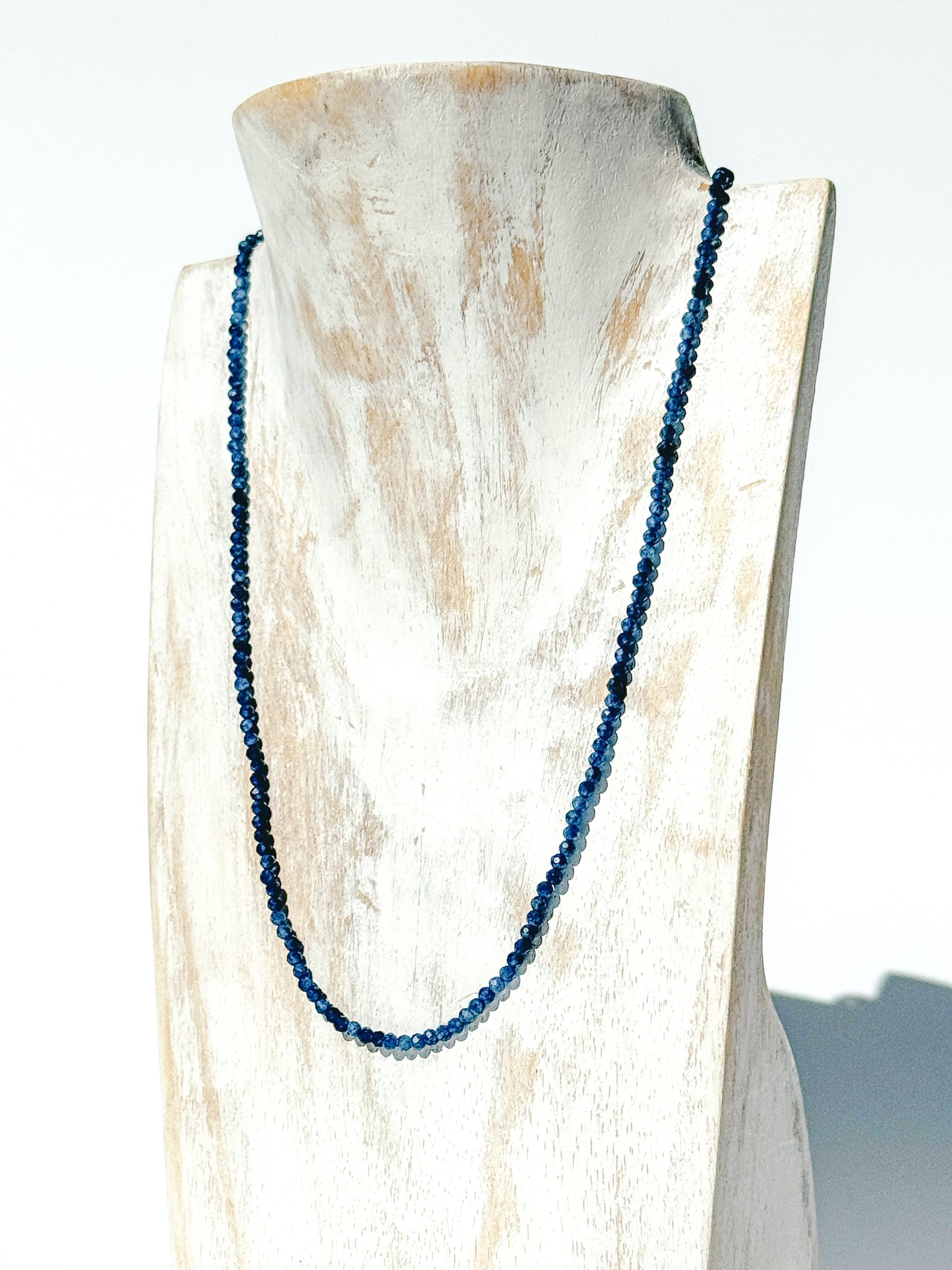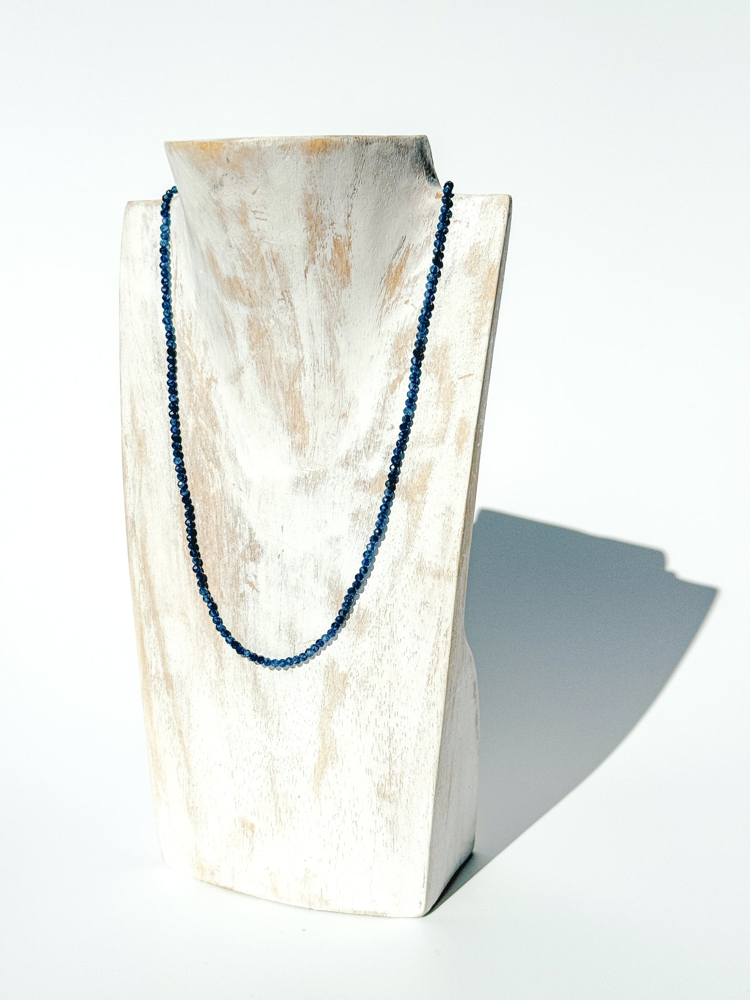 The Whisper Choker – Sapphire is delicate power embodied. Handcrafted with 2 mm faceted Sapphire gemstones, each deep-blue bead glows with quiet confidence — the colour of intuition, protection, and timeless grace. Elegant and weightless, this piece brings mental focus and emotional calm while strengthening your connection to inner truth.