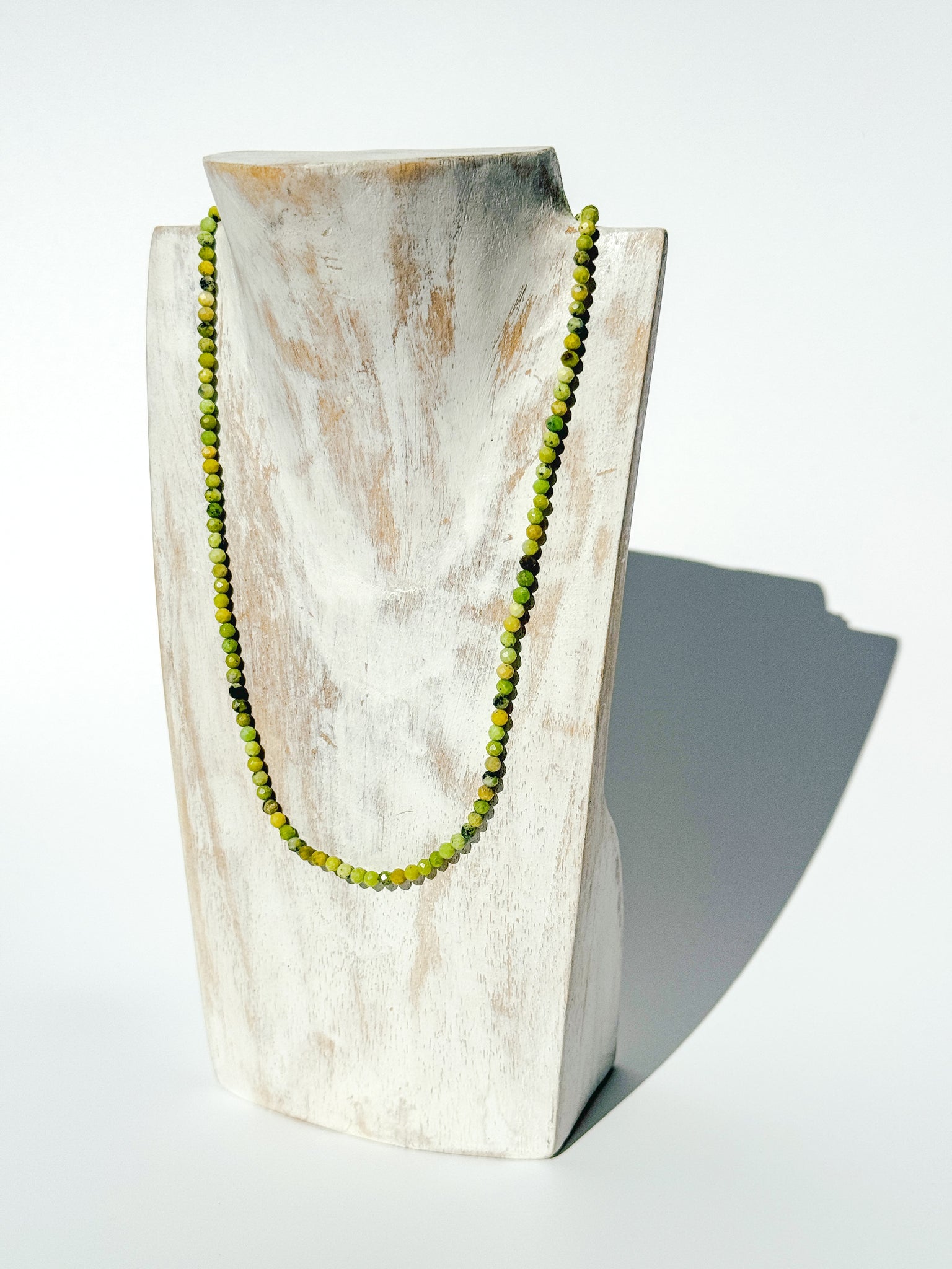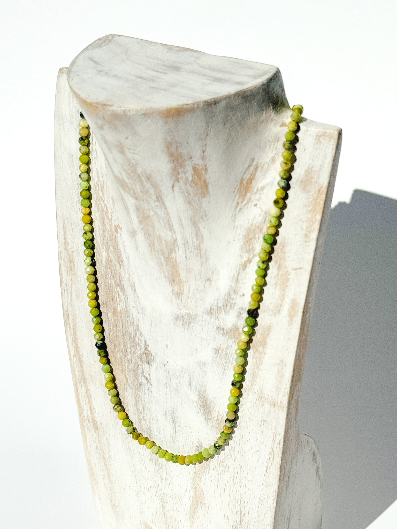 The Solace Choker – Serpentine carries the ancient vibration of transformation and rebirth. Handcrafted with 3 mm faceted Serpentine gemstones, its soft green tones mirror nature’s cycles of renewal — grounding you in calm vitality and gentle awakening. This minimalist piece brings balance to both heart and body, harmonising emotion and energy with quiet strength.