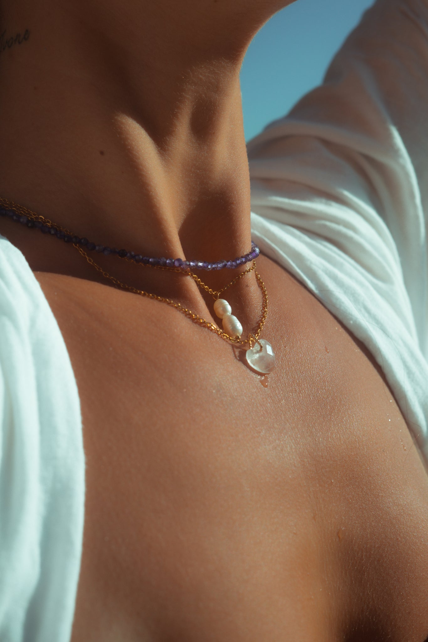 The Solace Choker – Amethyst is where minimalism meets mindfulness. Handcrafted with 3 mm faceted Amethyst gemstones, this sleek piece carries a serene lilac hue that symbolises peace, balance, and spiritual awareness. Its refined simplicity makes it a timeless piece for both everyday wear and intentional moments of stillness.